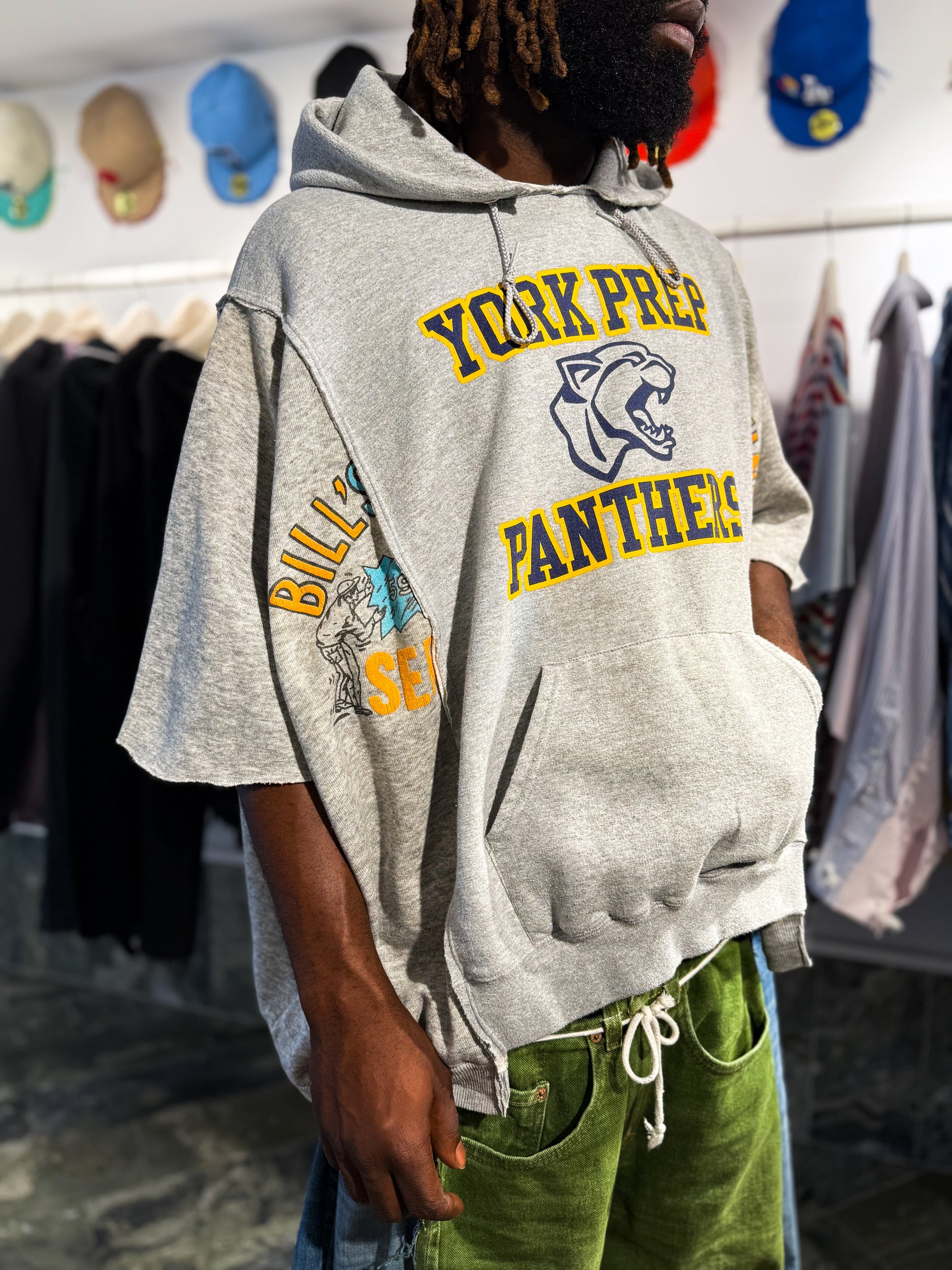 Crafted from two vintage hoodies we specially sourced for their colour, fit and quality. Recut, spliced and reworked in-house to create a new shape – cropped sleeves, oversized fit, double graphics. One of one.