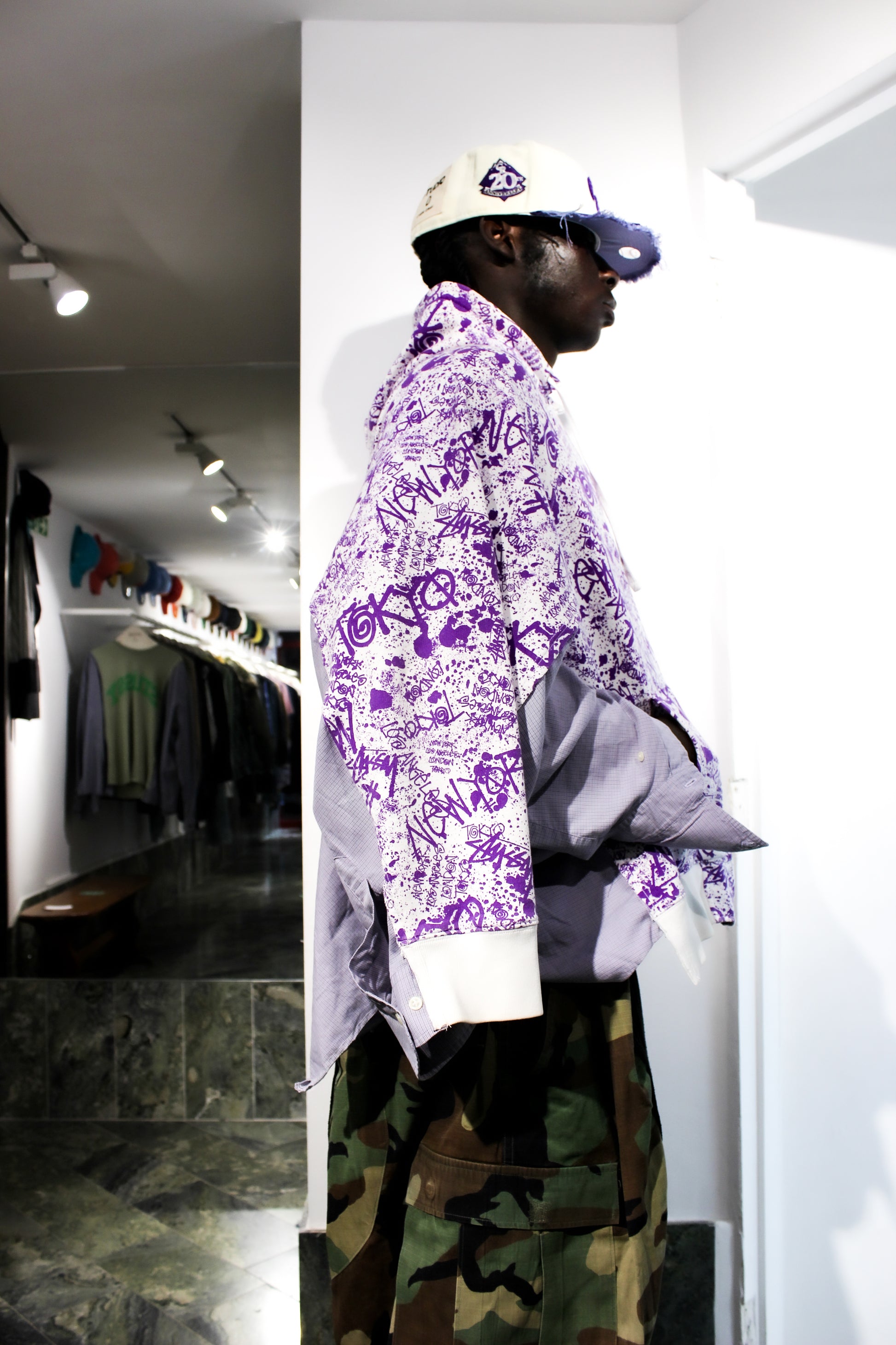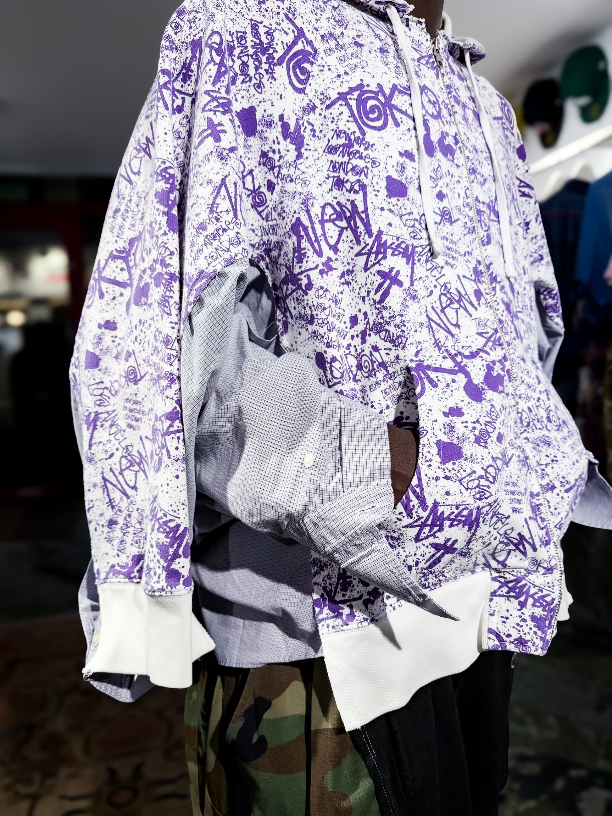 Made from a 90s era Stüssy hoodie and a dress shirt, this crewneck is hand cut and sewn into a new, fluid silhouette. The fit is intentionally floaty and oversized, giving you room to style it your way.