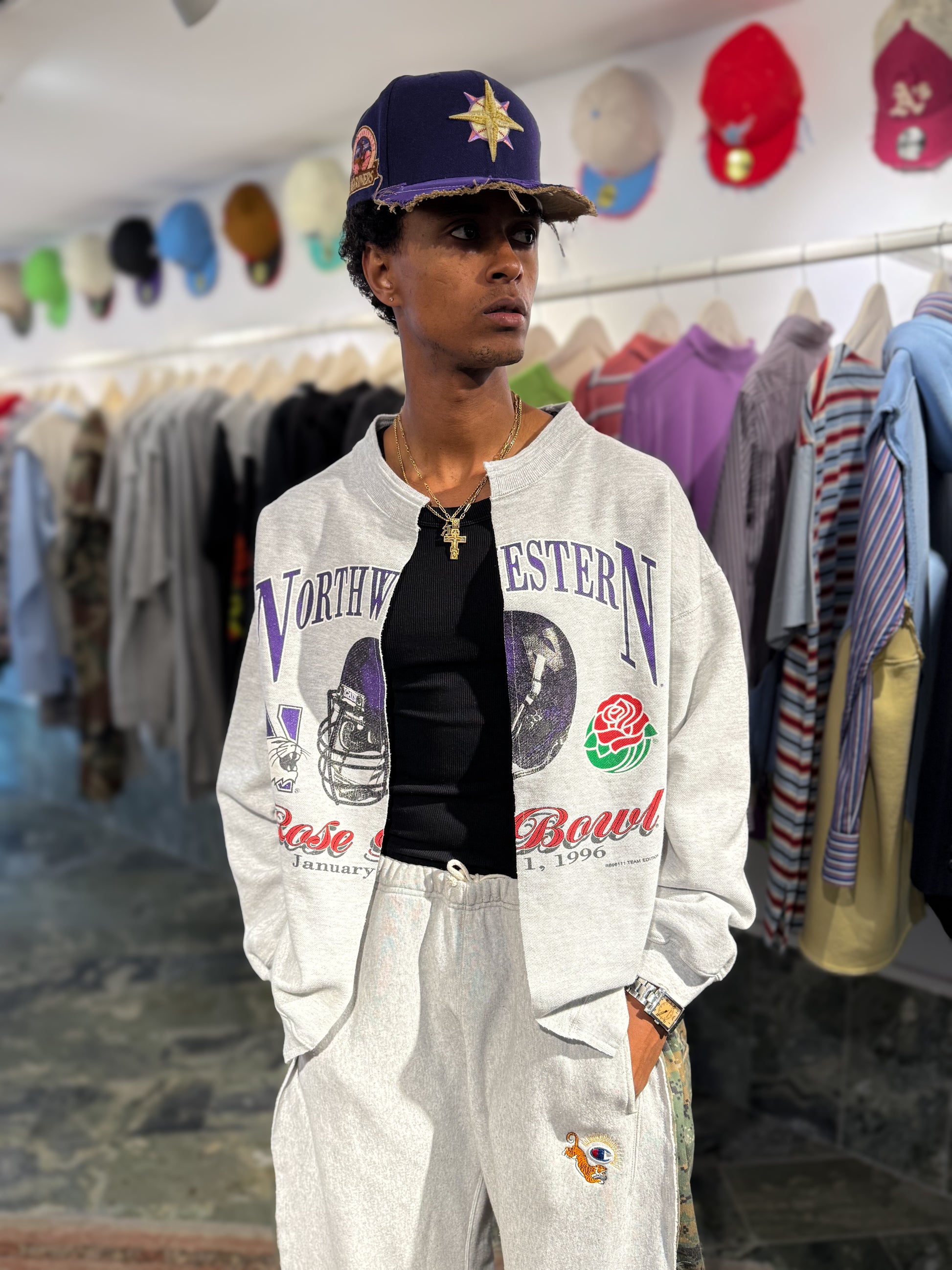 Crafted from a vintage 1996 Rose Bowl sweatshirt, this piece has been reworked into an open-front style. Features a raw spine seam down the back and a relaxed, oversized fit.